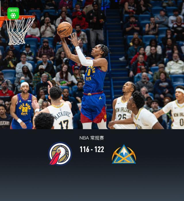 第四节鹈鹕特雷-墨菲拿下7分,掘金贾马尔-穆雷拿下12分,最终鹈鹕116-122不敌掘金